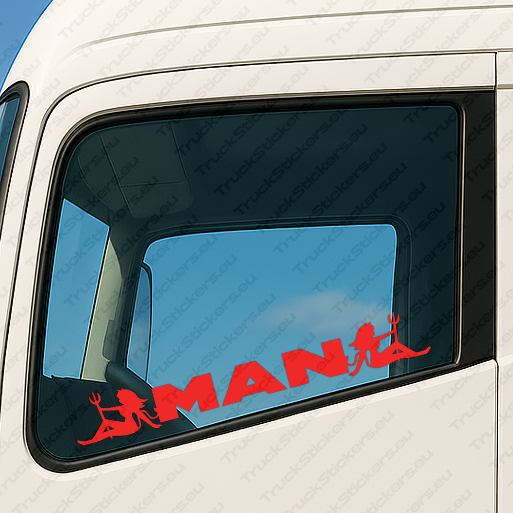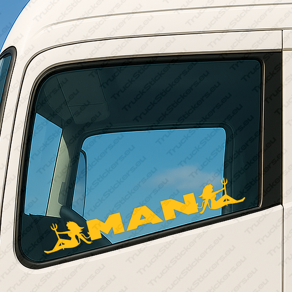 Mejora tu camión con el Man Pegatinas para Ventanas de Camión 90653 - Logo Clásico Con Mujeres Sosteniendo Un Tridente - Set de 2, un adhesivo de alta calidad diseñado específicamente para camiones y aplicaciones automotrices en exteriores. Fabricado con vinilo polimérico MACtac MaCal 9300, ofrece una durabilidad excepcional, colores intensos y un acabado limpio y profesional que resiste el desgaste diario.