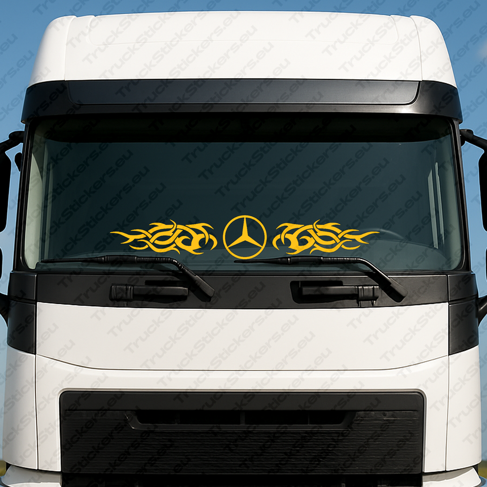 Améliorez l’apparence de votre camion avec le Mercedes Autocollant de Pare-Brise de Camion 90720-1 - Logo Classique Avec Graphiques Tribaux (115X19Cm) — un autocollant de pare-brise haut de gamme conçu pour un usage professionnel et les conditions extérieures exigeantes. Fabriqué en vinyle polymérique MACtac MaCal 9300, il offre une durabilité exceptionnelle, des couleurs profondes et une finition lisse et professionnelle qui résiste à l’usure quotidienne et aux intempéries.