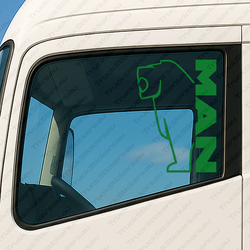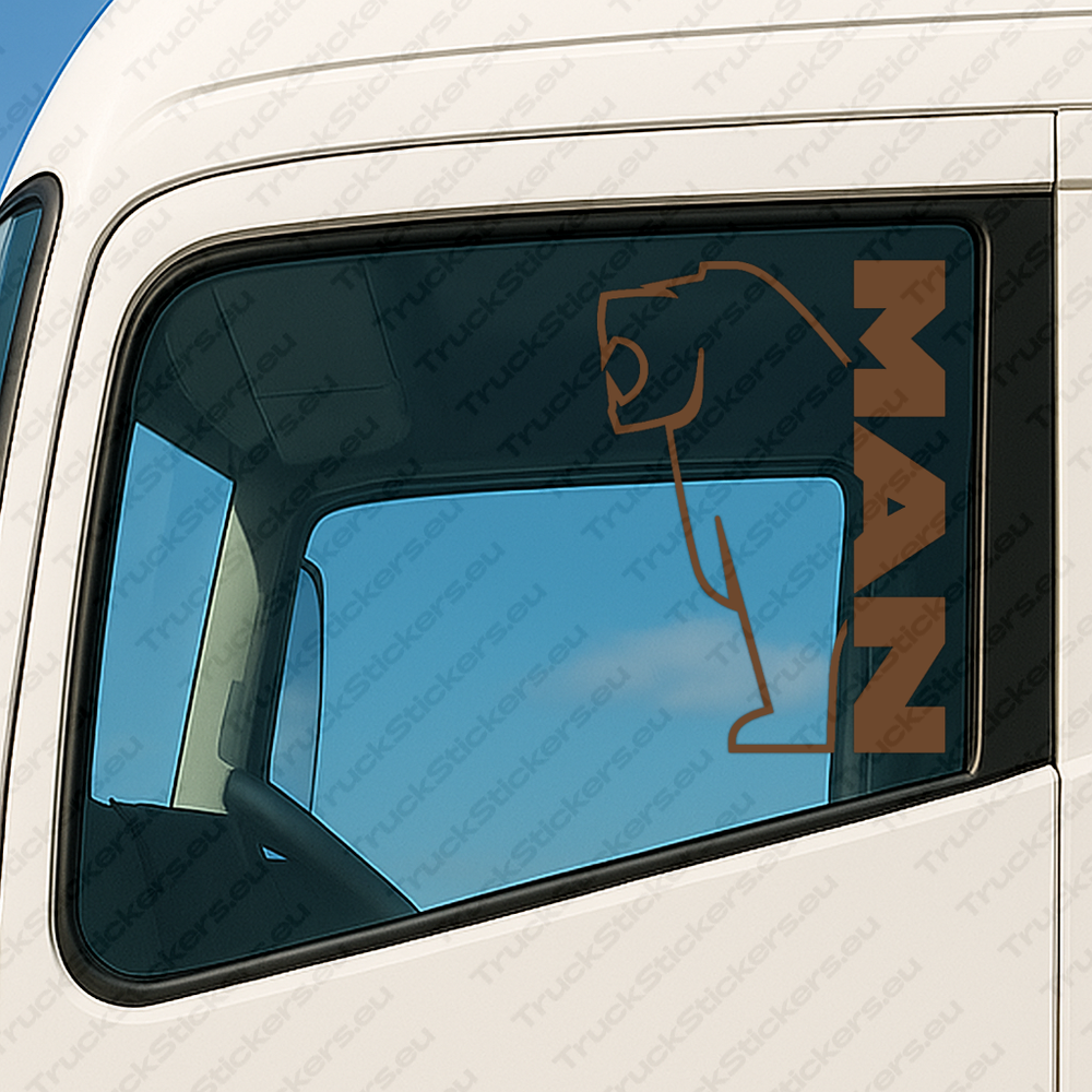 Enhance your truck with the Man Truck Window Stickers 90692 - Bold Vertical Text Logo with Big Lion Outline - Set of 2, a high-quality decal made for trucks and outdoor automotive use. Crafted from MACtac MaCal 9300 Polymeric Vinyl, it delivers exceptional durability, deep color, and a clean, professional finish that resists daily wear.