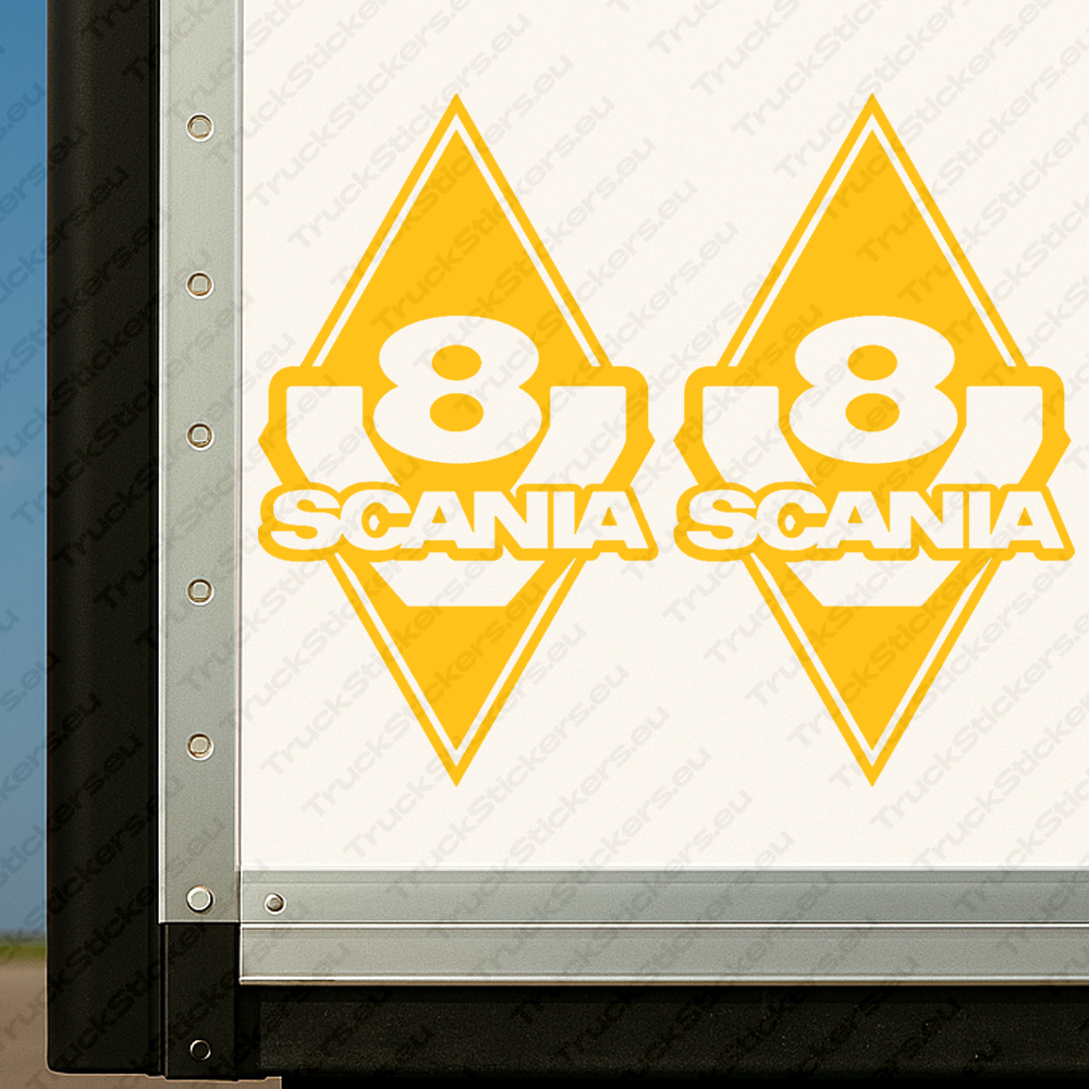Upgrade your vehicle with the Scania Truck Body Stickers 90233 - Rhombus with V8 and Text Logo - Set of 2 — a high-performance truck body sticker designed to handle demanding outdoor conditions. Made from MACtac MaCal 9300 Polymeric Vinyl, it delivers exceptional durability, vibrant colors, and a smooth, professional finish that stands strong against weather, washing, and daily use.