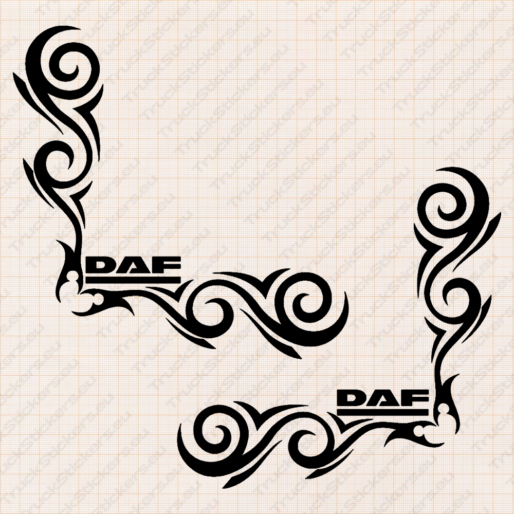 Daf Autocolante Pentru Geamuri de Camion 90628 – Logo Cu Text Subliniat Și Grafică Spirale Fluxante – Set De 2